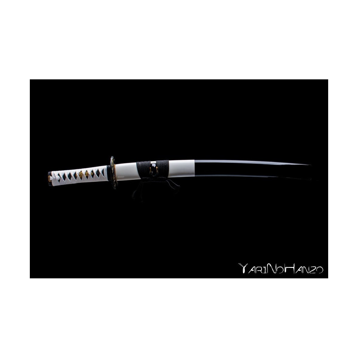 - Saya de madera lacada en colores negro/blanco, tsukaito blanco y piel de raya negra.