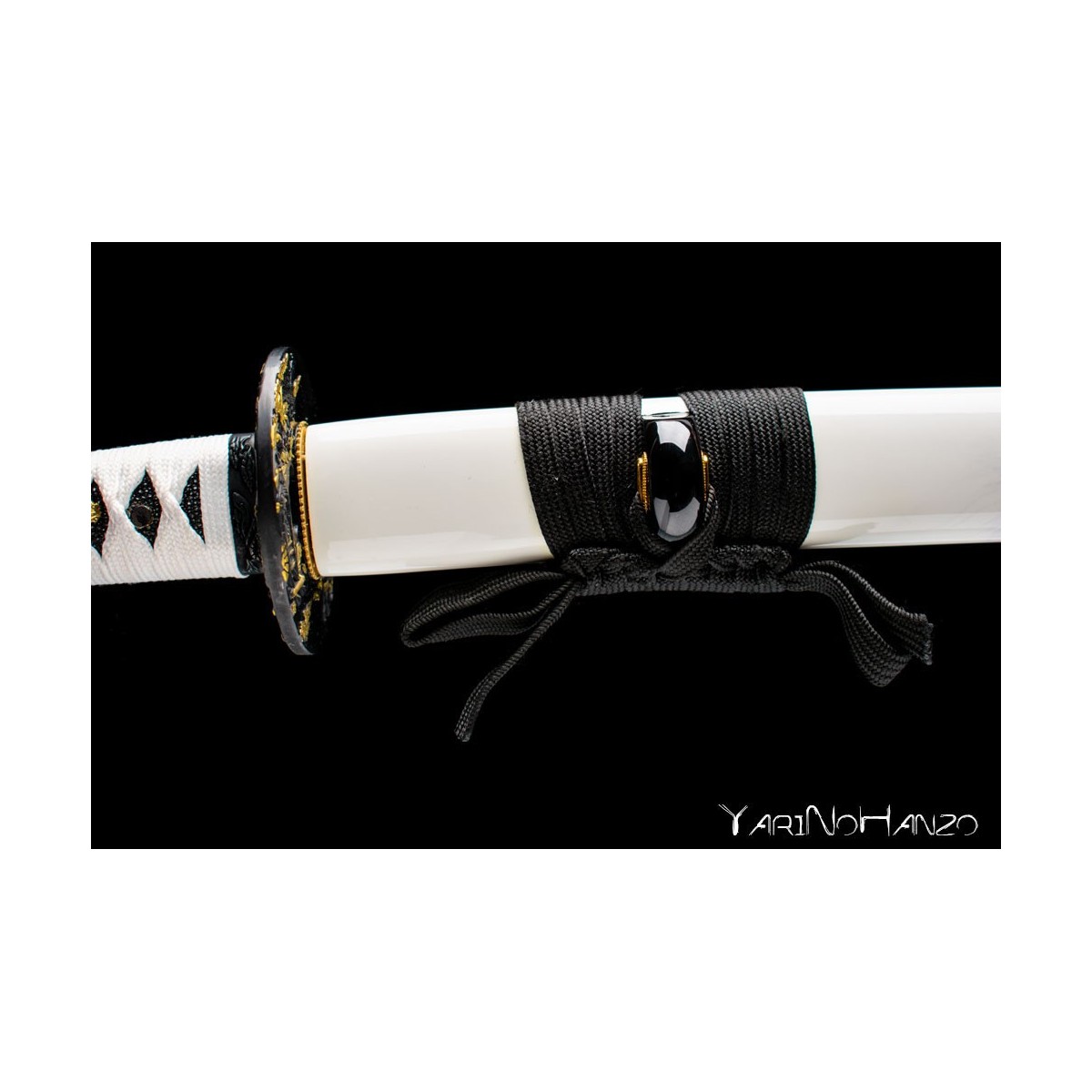 Su diseño elegante incluye saya lacada en blanco y negro, tsuka con tsukaito blanco sobre piel de raya negra, garantizando resistencia y comodidad.