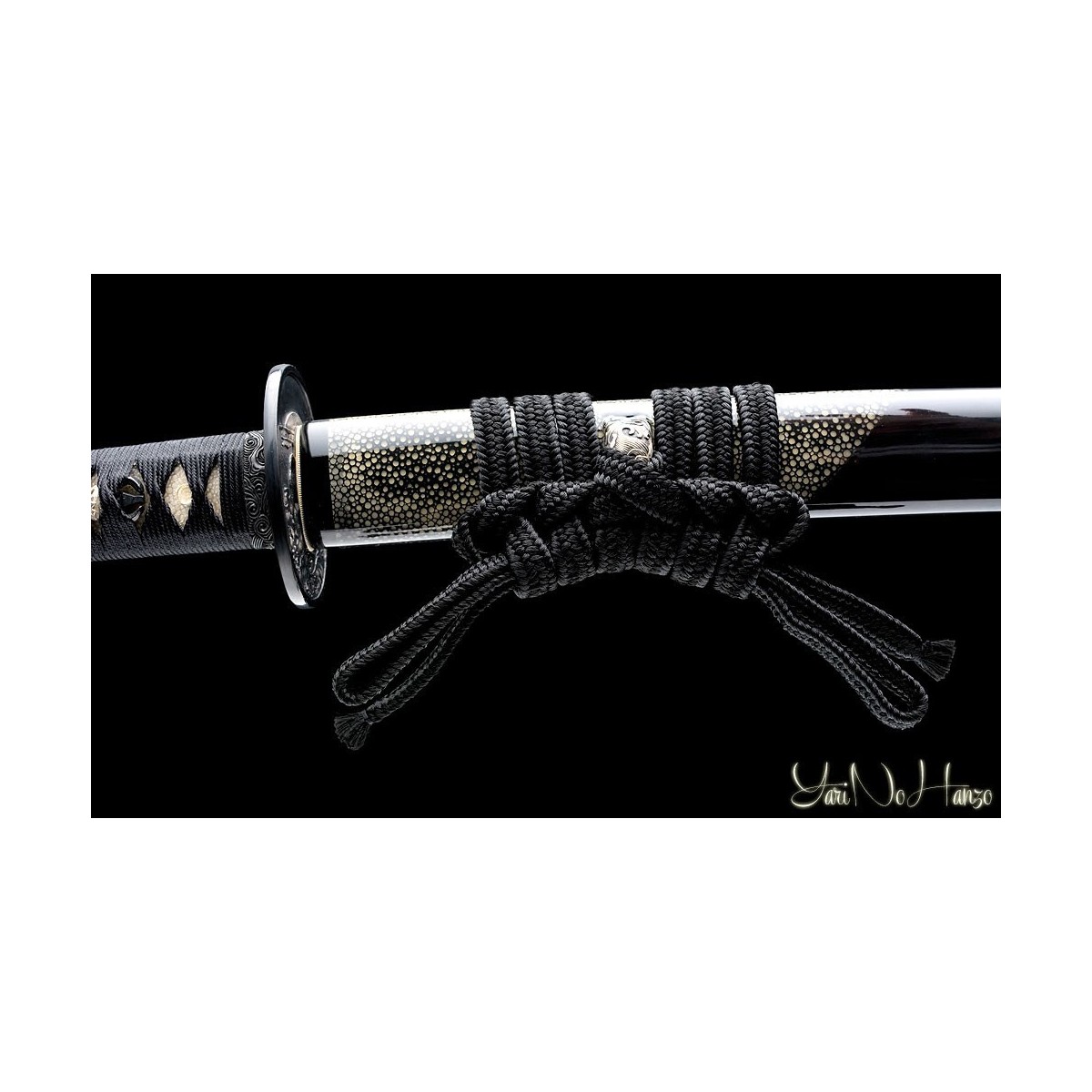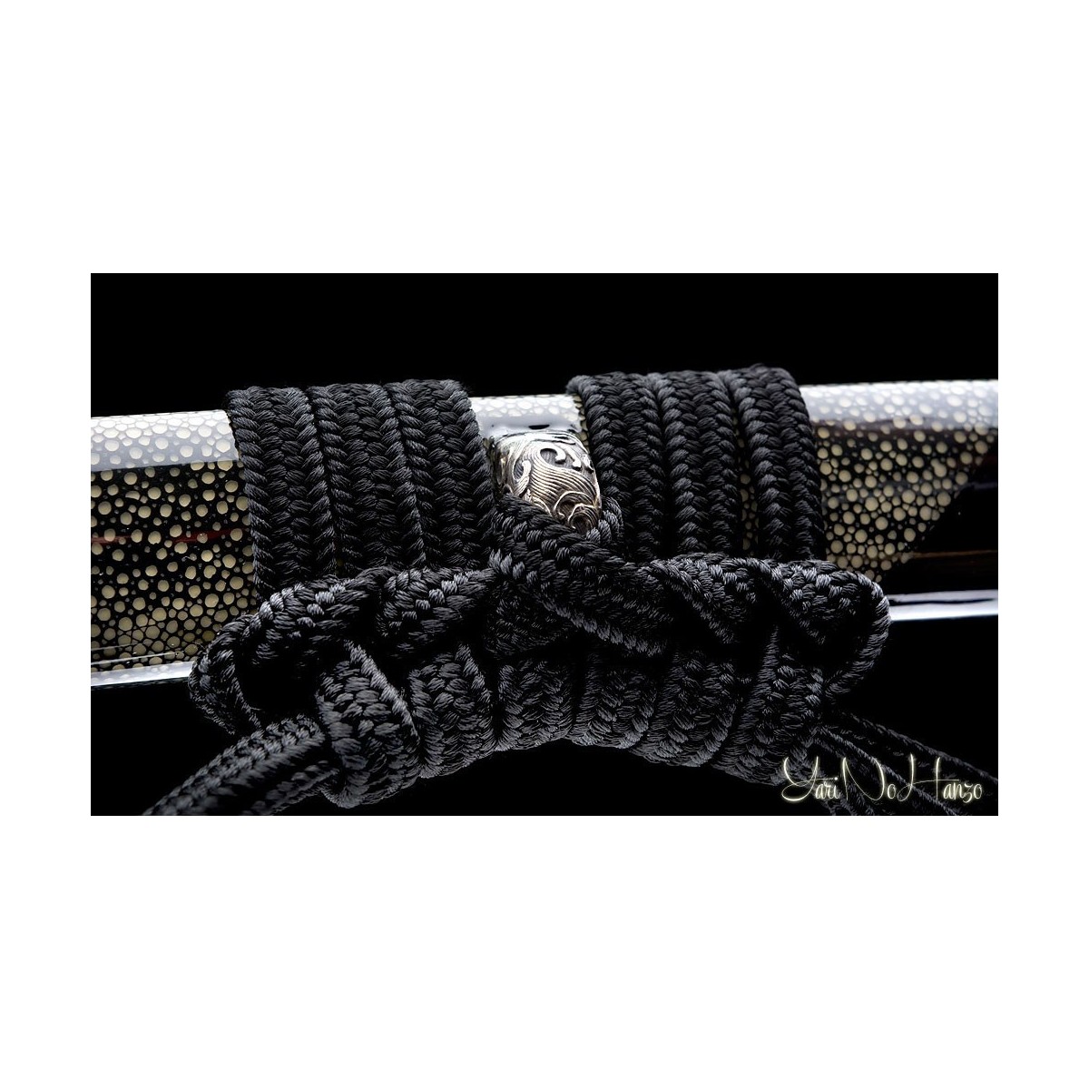- Saya de madera de alta calidad lacada en negro, decorada con auténtica piel de raya, reforzada con cuerno de búfalo.